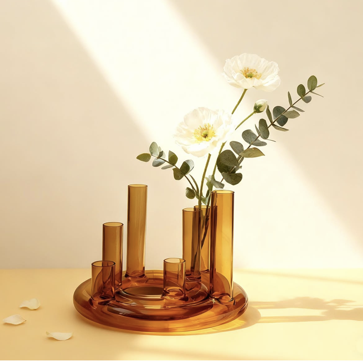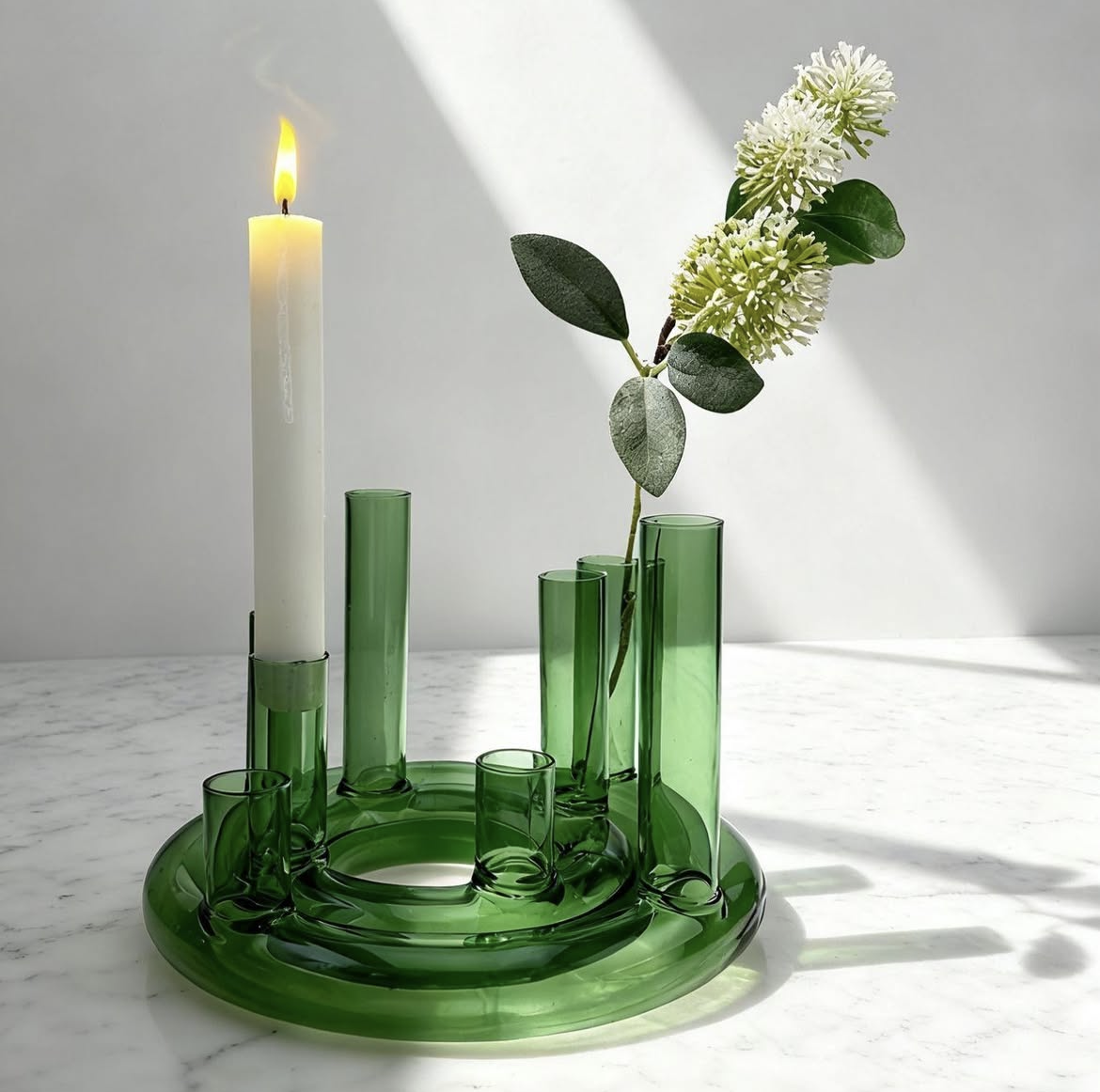 Two glass circles, combined or separate, with connecting tubes for flowers or candles. Playful and creative. Produced and sold by T&T Glassware.